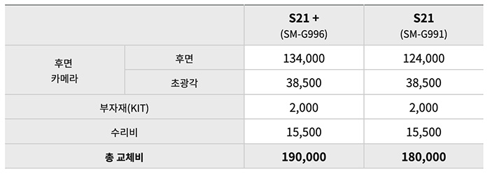 갤럭시 21 울트라와는 다르게 21과 21플러스는 후면 카메라와 초광각만 존재하기에 총 교체 비용이 저렴하죠.