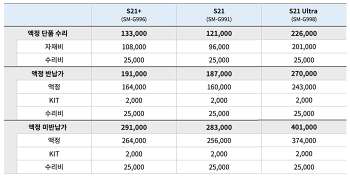 삼성 갤럭시 S21, 21플러스, 21 울트라 액정 수리비 교체 비용