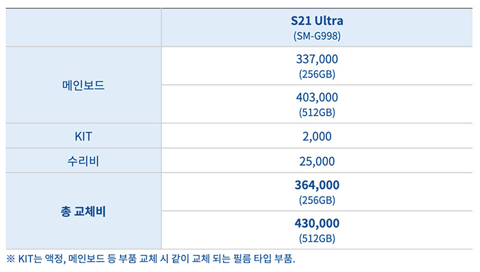 갤럭시 21 울트라 메인보드 총 교체비용 256GB :365,000원 512GB : 430,000원