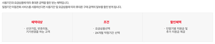 그 밑의 "요금 할인"은 선택약정의 부분인데 공시 지원금을 받지 않고 달마다 요금의 일정 부분을 할인 받는 방식입니다. 자급제도 해당 약정 가입이 가능하기에 이건 비교에 큰 의미가 없지만요. (선택약정은 단말기에 대한 할인이 없고 요금제만 할인받는거라 출시된 가격을 다 주고 가입하는 방식입니다.)