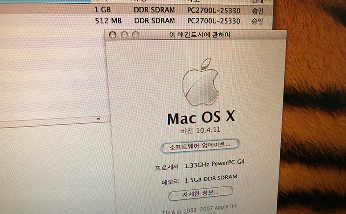 파워북의 전원 버튼을 누르면 요즘 노트북처럼 바로 부팅을 시작하는게 아니라 10초정도 뜸 들이고 부팅을 하더군요. 정상적으로 파워북 g4의 부팅을 확인하고 시스템 사양을 확인했습니다. 1.33GHz PowerPc G4를 사용했는데 파워북까지만 사용을 하고 그 뒤로는 인텔 CPU로 넘어갔습니다. (2006년쯤에 파워피씨의 사용은 막을 내렸죠.)