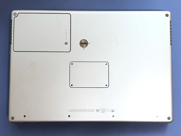 powerbook G4의 후면입니다. 지금은 보기 힘든 탈착형 배터리인데 배터리를 제거 할 때에는 중앙의 둥근 부분을 돌려서 배터리를 제거합니다. 옛날 노트북의 장점인 메모리 교체가 용이한 부분도 보입니다. 중앙의 네모난 부위의 나사 4개를 제거하면 램을 바로 교체할 수 있습니다.