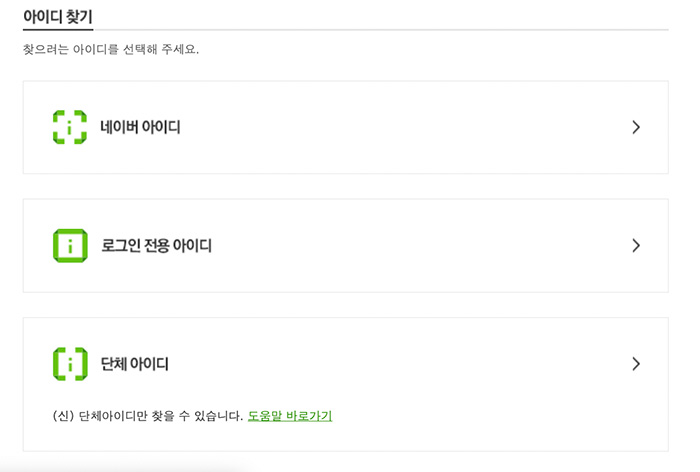 2. 제가 찾을 네이버 아이디는 단체 아이디도 아니고 로그인 전용 아이디도 아닌 일반 "네이버 아이디"라서 맨위의 메뉴를 선택했습니다.