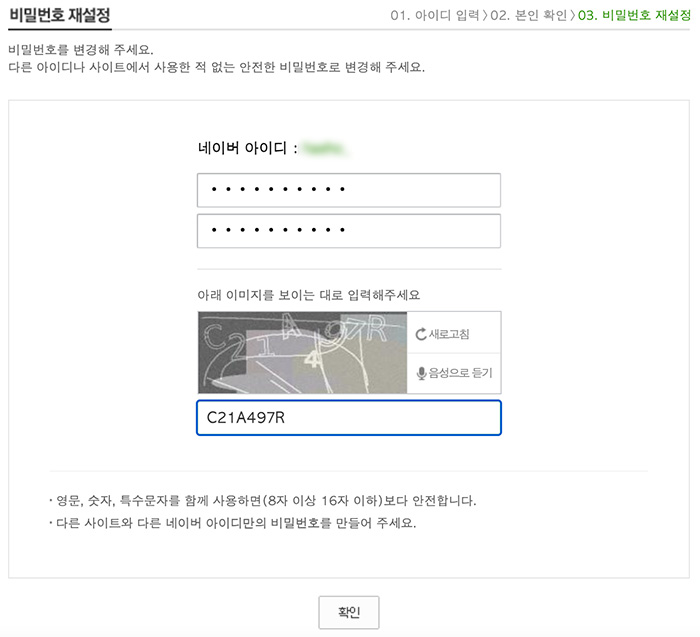아이디 찾기를 진행했기에 따로 인증은 없고 만약 바로 네이버의 비밀번호 찾기를 진행했다면 한번의 인증이 필요합니다. 아이디의 변경할 비밀번호를 입력한 뒤에 다시 확인 절차로 재입력하고 하단에 봇이나 매크로인지 확인하는 보안문자 절차를 통과하면 네이버 아이디의 비밀번호가 변경완료됩니다.