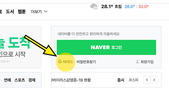 1. 네이버 메인 화면의 로그인 영역에 위치한 자물쇠 아이콘 옆의 "아이디"를 선택합니다. 아이디를 이미 알고 있다면 그 옆의 비밀번호찾기를 선택해서 비번을 찾아는것도 가능합니다.