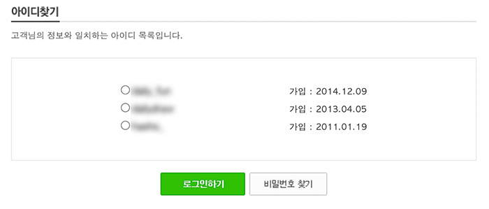 4. 네이버의 인증 단계를 거치면 정보와 일치하는 아이디의 목록이 나타납니다. 저는 3개 다 만들었기에 3개의 계정이 나타났고 그 옆에는 해당 아이디를 생성했던 날짜가 나옵니다. 간단하게 인증 한번으로 생성했던 아이디들을 모두 확인이 가능합니다.