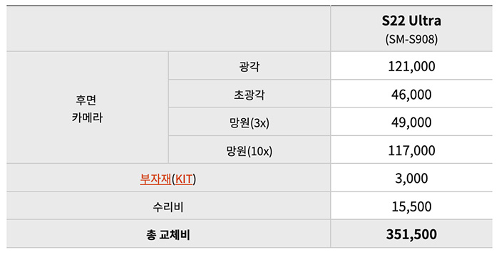 - S22 Ultra(SM-S908) : 광각 121,000원 / 초광각 46,000원 / 망원(3X)49,000원 / 망원(10X)117,000원 / 총 교체비용 351,500원