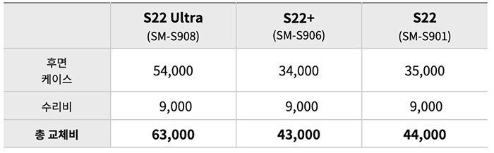 - S22 Ultra(SM-S908) : 후면 케이스 교체비용 54,000원