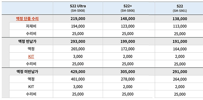 - S22 Plus (SM-S906) : 액정 단품 수리비 148,000원 / 액정 반납 수비리 199,000원