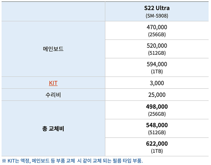 - S22 Ultra(SM-S908) : 메인보드 총 교체비 256GB 498,000원 / 512GB 548,000원 / 1TB 622,000원