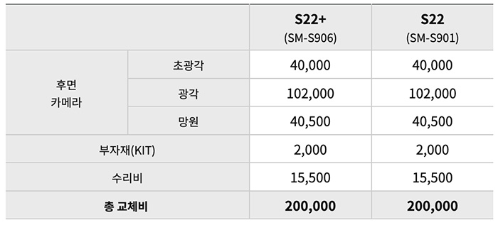 - S22 Plus (SM-S906) : 초광각 40,000원 / 광각 102,000원 / 망원 40,500원 / 총 교체비용 200,000원