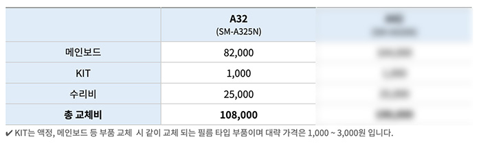 - 갤럭시 A32 메인보드 교체비 : 메인보드 82,000원 + KIT 비용 1,000원 + 수리비 25,000원 = 총 교체비 108,000원