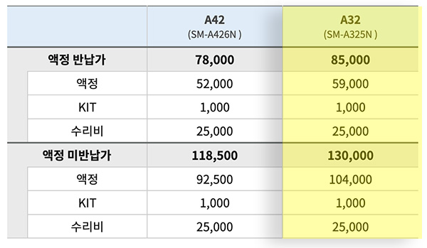 - 갤럭시 A32 액정 수리 비용 : 액정 반납가 85,000원 / 액정 미반납가 130,000원