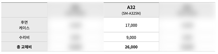- A32 후면 케이스 교체 금액 : 후면 케이스 17,000원 + 수리비 9,000원 = 총 교체금액 26,000원