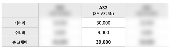 - 삼성 갤럭시 A32 배터리 교체 비용 : 배터리 30,000원 + 수리비 9,000원 총 교체비용 39,000원