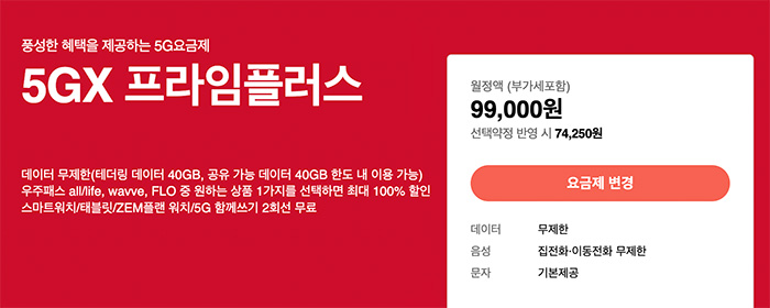 총 무제한의 데이터를 제공하고 데이터를 속도 제한 없이 이용이 가능합니다.(테더링 40GB,함께쓰기 등 40GB 별도 제공) 집전화와 이동전화는 제한이 없으며 가격은 99,000원입니다. (선택약정 반영시 74,250원) 주요 부가 혜택은 멤버십 VIP, 스마트기기 2회선 무료, Wavve/Flo/우주패스 택1 무료, 파손보험 무료의 혜택이 있습니다. 비싼만큼 뭘 많이 주네요.