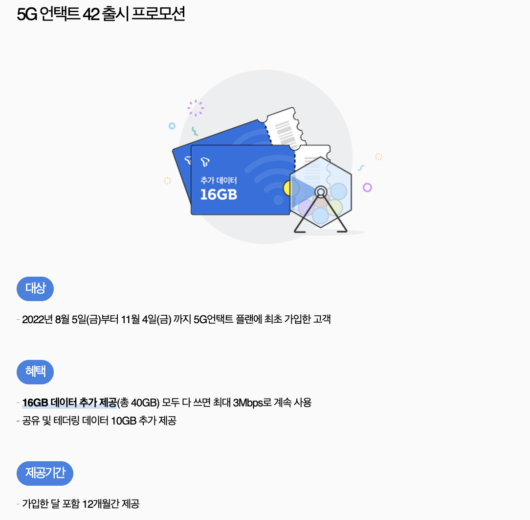 주요 부가 혜택은 없지만 역시 프로모션으로 1년 동안 16GB의 데이터를 추가로 제공해서 총 40GB의 데이터를 이용하고 데이터 소진시 1Mbps가 아닌 3Mbps의 속도로 이용이 가능합니다. 앞에 소개한 언택트34와 다르게 공유 및 테더링 데이터 10GB를 추가로 제공합니다.