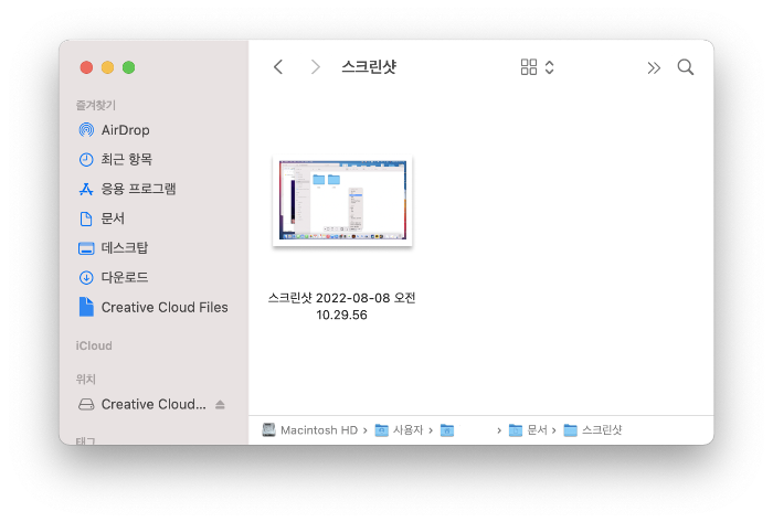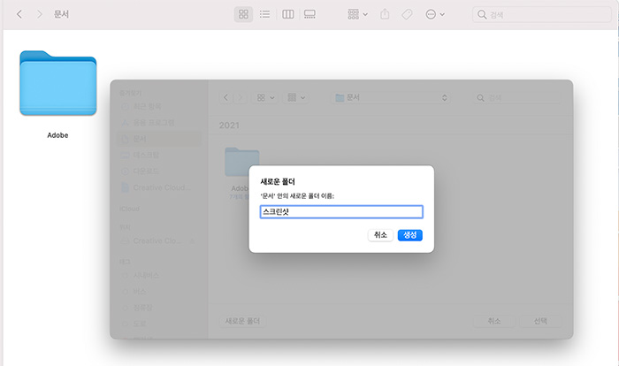 2. 저는 맥북의 "문서" 폴더의 "스크린샷"이라는 폴더를 추가로 생성해서 해당 폴더에 화면을 기록한 파일을 저장하기로 지정했습니다.