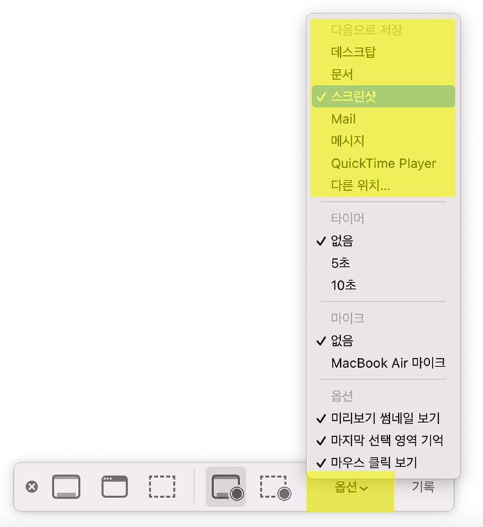 1. command + shift + 5 키를 동시에 누르면 맥북의 스크린샷 메뉴가 나타납니다. 오른쪽에 보이는 "옵션"을 선택하면 "다음으로 저장" 탭에서 자신이 저장하고 장소를 선택하면됩니다. 새로운 폴더에서 저장을 원한다면 "다른 위치"를 선택하세요.