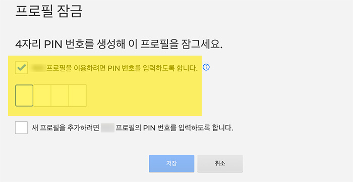 4. 넷플의 프로필 잠금 설정은 "XX프로필을 이용하려면 PIN 번호를 입력하도록 합니다".에 체크를 한 뒤에 4자리 숫자를 입력하고 "저장"을 선택합니다. 하단의 옵션은 새 프로필을 추가할 경우 프로필의 PIN 번호를 입력해야지 새 프로필이 추가된다는 옵션입니다. 가족끼리 이용하는거면 큰 의미는 없겠죠.