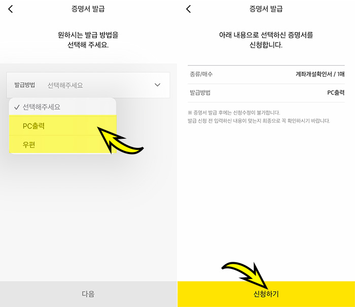 3. 이제 증명서 발급에서 원하는 방급 방법을 선택합니다. Pc출력이 있고 또 다른 방식으로 우편으로 받는 방법이 있습니다. 저는 먼저 PC에서 출력하는 방법을 선택해보겠습니다. 선택하고 다음으로 넘어가면 계좌개설확인서가 맞는지 그리고 발급매수와 발급방법을 확인 뒤에 "신청하기"를 선택해주세요.