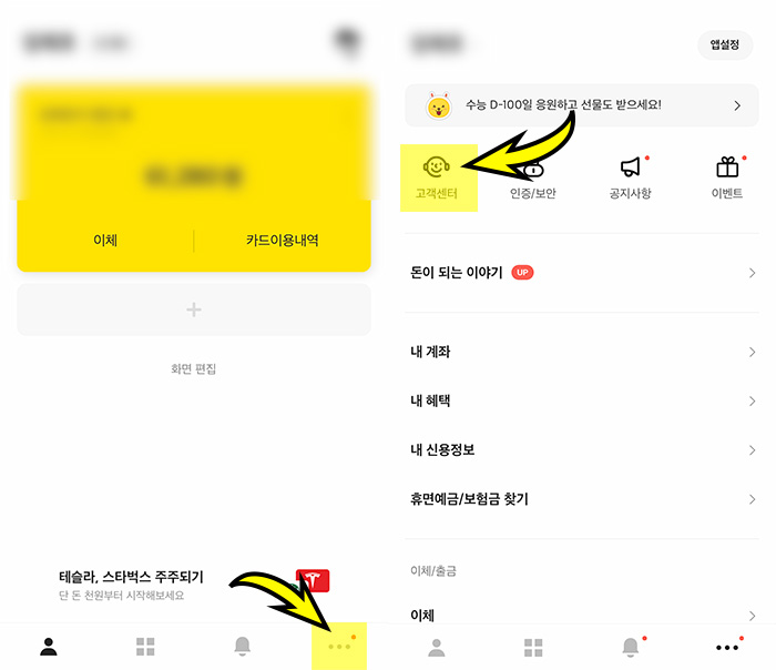 1. 통장 사본 발급 방법과는 조금 다릅니다. 카카오뱅크 앱을 실행하고 하단의 점 3개를 선택해서 설정 화면으로 이동합니다. 상단에 보이는 "고객센터" 아이콘을 선택해주세요. (카뱅 계좌개설 확인은 앱의 고객센터에서 신청하여 발급받습니다.)