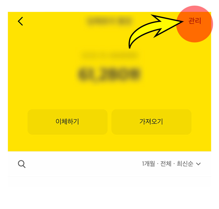 2. 자신의 카뱅 계좌와 잔액 그리고 사용내역들이 나오는 화면인데 여기서 상단 오른쪽에 "관리"를 선택해주세요.