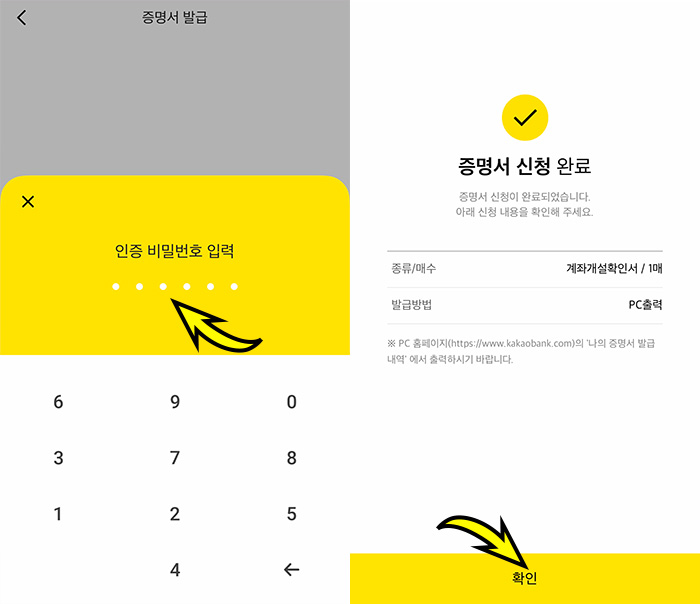 4. 계좌발급확인서를 신청하면 카카오뱅크의 인증 비밀번호를 입력해야합니다. 입력이 완료되면 증명서 신청이 끝나는데 이제 Pc로 이동해서 카카오뱅크에 접속한 뒤에 로그인하여 신청한 증명서를 출력해야합니다.