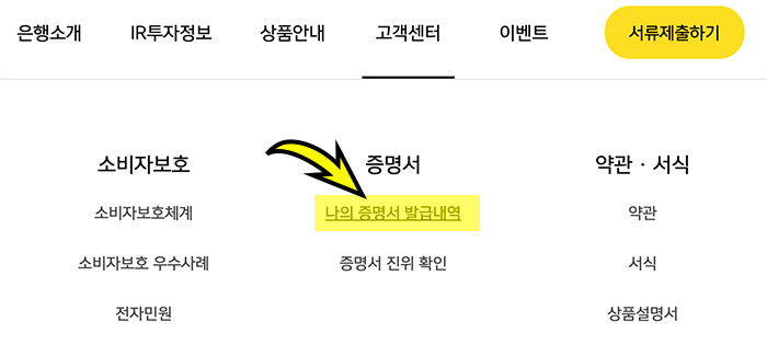1. 카카오뱅크에 로그인하여 "고객센터"의 "나의 증명서 발급내역"을 선택합니다. 물론 카카오뱅크에 로그인 한 상태여야지 확인과 출력이 가능합니다.
