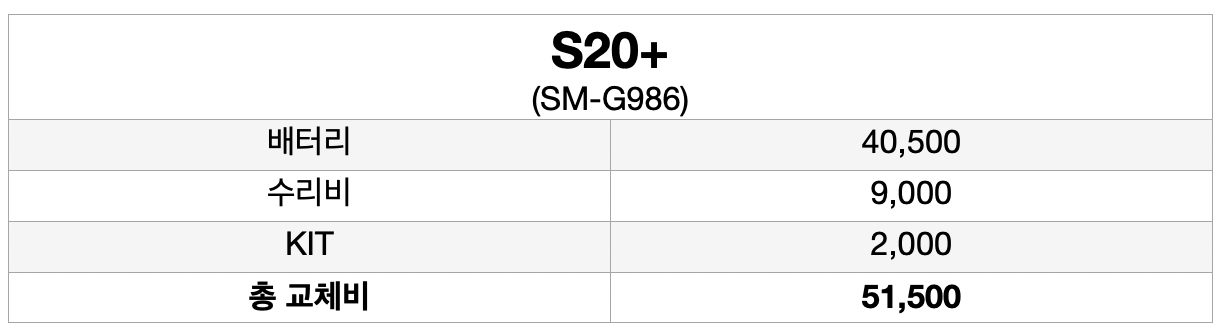 삼성 갤럭시 S20 + (sm-g986) 모델의 배터리 교체 예상 비용은 [ 배터리 40,500원 + 수리비 9,000원 + KIT 2,000원 = 총교체비 51,500원 ] 입니다.