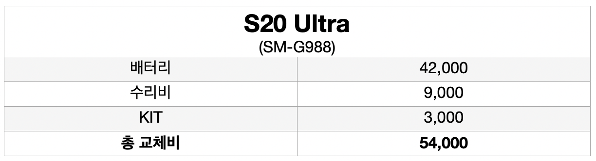 삼성 갤럭시 S20 울트라 Ultra (sm-g988) 모델의 배터리 교체 예상 비용은 [ 배터리 42,000원 + 수리비 9,000원 + KIT 3,000원 = 총교체비 54,000원 ] 입니다.