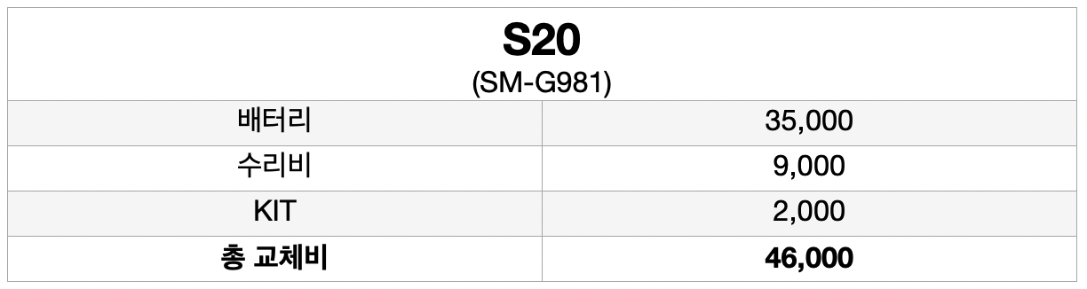 삼성 갤럭시 S20 (sm-g981) 모델의 배터리 교체 예상 비용은 [ 배터리 35,500원 + 수리비 9,000원 + KIT 2,000원 = 총교체비 46,000원 ] 입니다.