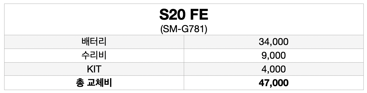 갤럭시 S20 FE (sm-g781) 모델의 배터리 교체 예상 비용은 [ 배터리 34,000원 + 수리비 9,000원 + KIT 4,000원 = 총교체비 47,000원 ] 입니다.
