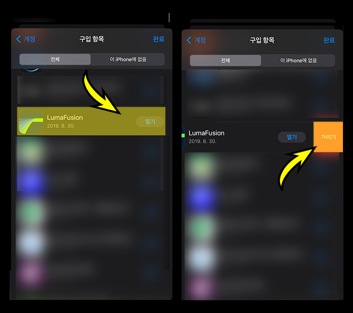 여기서 구입 항목에서 보기 싫은(?) 앱이 있다면 해당 항목을 스와이프해서 (손가락으로 옆으로 밀기) "가리기" 옵션을 나타나게 합니다. 말 그대로 구입 항목에서 가려주는 (완전한 삭제는 아님) 방식입니다.