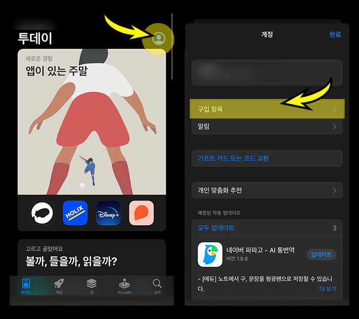 1. 아이폰의 앱스토어를 실행합니다.우측 상단의 사람 모양의 "계정" 아이콘을 선택해주세요. 계정 페이지로 이동해서 "구입 항목"이 보일겁니다. 네.. 여기서 삭제 (숨기기)를 진행합니다.