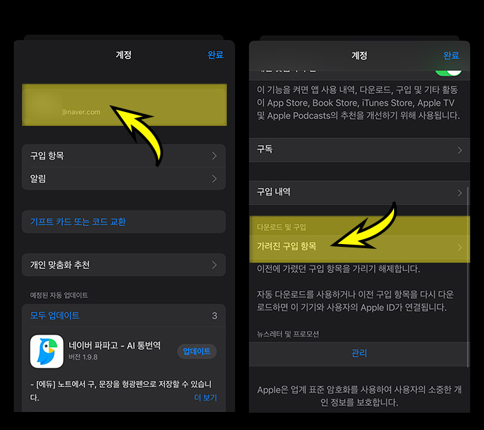1. 아이폰의 계정 페이지에서 "구입 항목"이 아닌 자신의 이름과 이메일 부분을 선택합니다. 지워진 구매 항목을 복구 하는 것은 자신의 계정 설정으로 이동해야합니다. 이름과 이메일 부분을 선택했다면 스크롤을 내려서 "다운로드 및 구입" 탭이 보일겁니다. 거기에서 "가려진 구입 항목"을 선택한 뒤에 원하는 앱을 골라서 가리기 해제를 해주면 정상적으로 구입 항목에 해당 앱이 나타납니다.