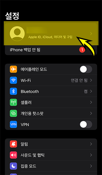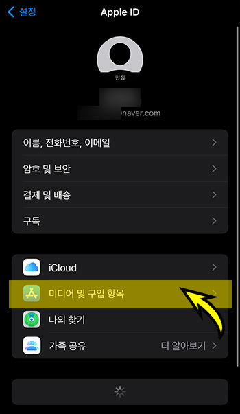 1. 아이폰의 설정에 진입하면 맨 위에 자신의 이름과 Apple ID, iCloud, 미디어 및 구입 항목이 보이는데 거기를 선택하세요. 그리고 "미이더 및 구입 항목"으로 이동합니다.
