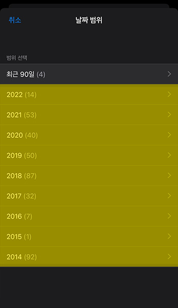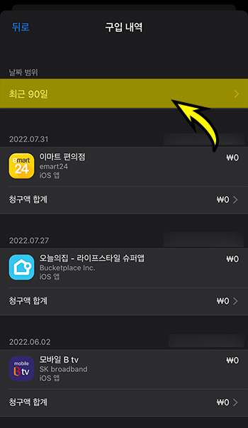 4. 이제 "구입 내역"인데 애플 아이폰을 사용하면서 앱스토어에서 구입했던 앱들의 가격과 정보들이 년도별로 출력됩니다. 처음에는 최근 90일 기준으로 나타나는데 "최근 90일" 부분을 선택해서 날짜 범위를 지정할 수 있습니다. 1년 단위로 선택이 가능하고 더 디테일하게 월별로도 볼 수 있습니다.
