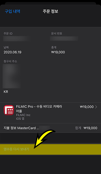 5. 구입내역에서 자세한 정보를 보고 싶은 앱이 있다면 청구액 합계 부분을 선택하면 "주문 정보" 페이지로 이동합니다. 저는 필믹프로 유료 앱을 구매했던 내용을 자세하게 보고 싶어서 주문 정보를 확인해봤습니다. 날짜와 총금액, 청구 주소, 지불 카드의 정보 등의 결제 정보들이 출력됩니다. 아! 그리고 하단의 "영수증 다시 보내기"를 선택하면 해당 영수증이 자신의 이메일로 전송됩니다!