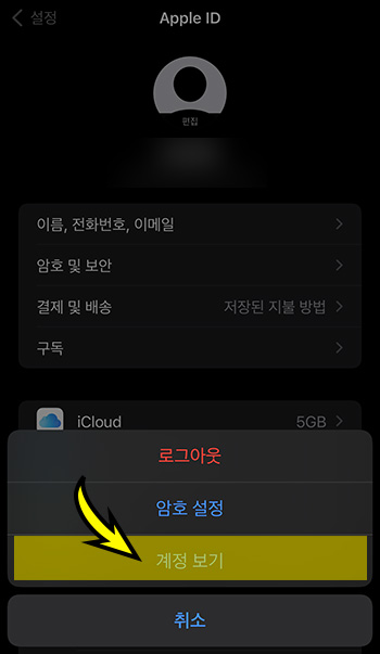 2. 미디어 및 항복 보기를 선택하면 팝업으로 메뉴가 나타납니다. "계정 보기"를 선택하고 계정에서 "구독"과 "구입내역"에서 원하는 정보를 찾으면됩니다.