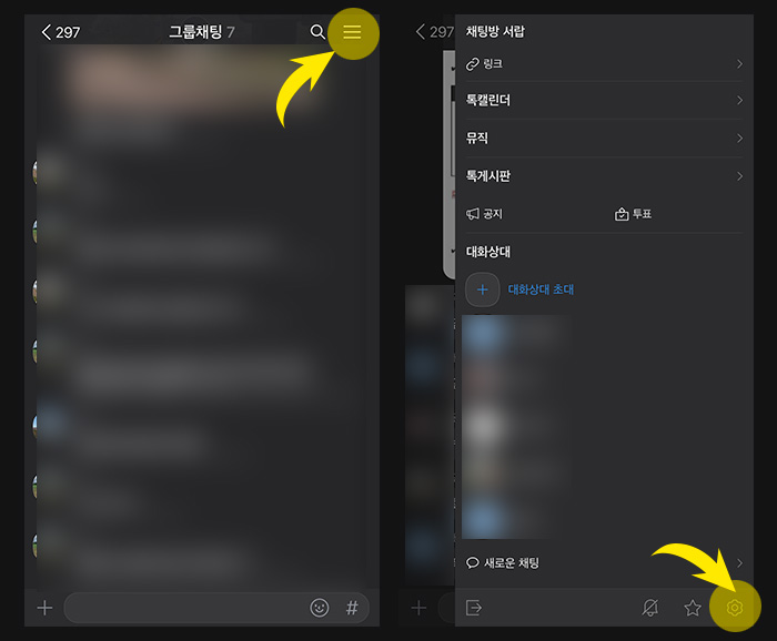 1. 자신이 속한 그룹채팅방의 오른쪽 상단 3줄 메뉴 버튼을 선택합니다. 우측에서 팝업으로 메뉴가 나오는데 맨 하단의 톱니바퀴 아이콘을 눌러 그룹채팅방 설정으로 이동합니다.