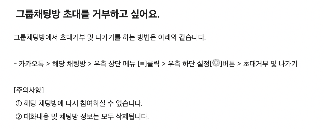 카카오톡의 그룹채팅방 초대거부에 대한 카카오 고객센터의 답변입니다. 주의사항을 보면 "해당 채팅방에 다시 참여하실 수 없습니다." 문구를 확인할 수 있는데요. 이게 해제 설정이 가능한 거부가 아니라 "완전 거부"라서 다시 초대가 불가능합니다.
