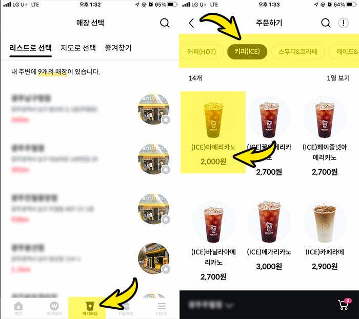매장을 선택하면 음료를 고르는 화면으로 이동하는데 상단에는 음료의 카테고리(커피/스무디/에이드/디저트 등등으로 분류됨)를 선택하고 하단에 나타나는 커피를 터치하면됩니다. 저는 "커피(ice)"에서 "(ice)아메리카노"를 선택했습니다.