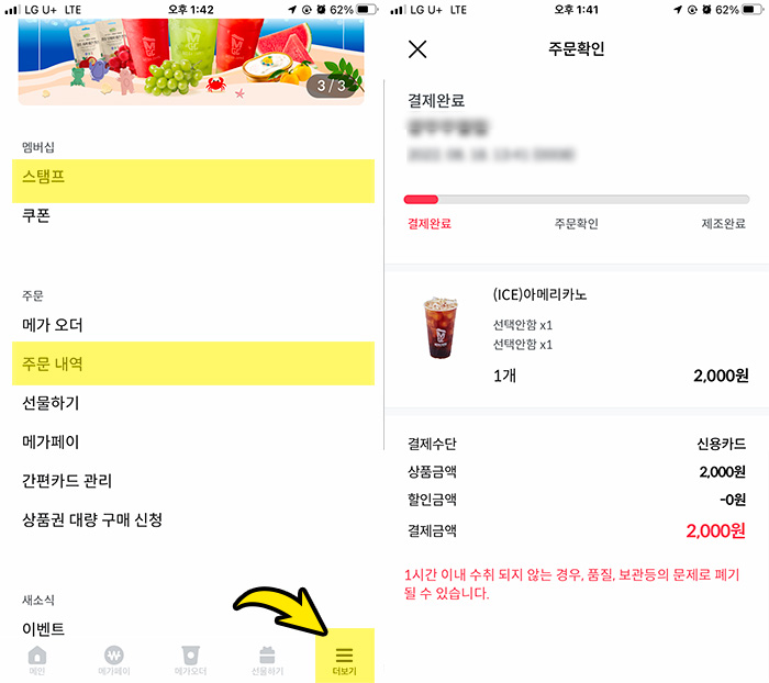 메가커피 무료 쿠폰 사용과 스탬프 적립 방법