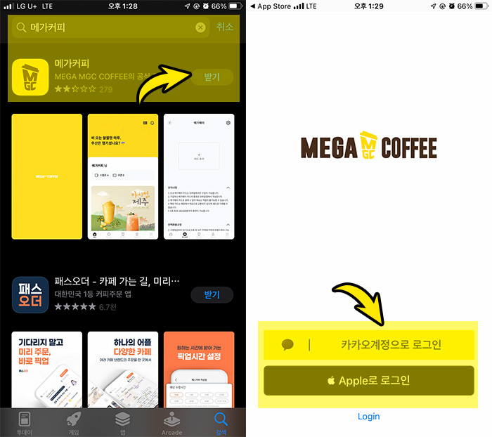 저는 아이폰이라서 앱스토어에서 "메가커피"를 검색해서 설치했습니다. 다운받은 메가커피 앱을 실행하면 로그인 화면이 나오는데 아이디가 없어서 편하게 카카오 계정으로 로그인을 선택한 뒤에 가입을 진행했습니다.