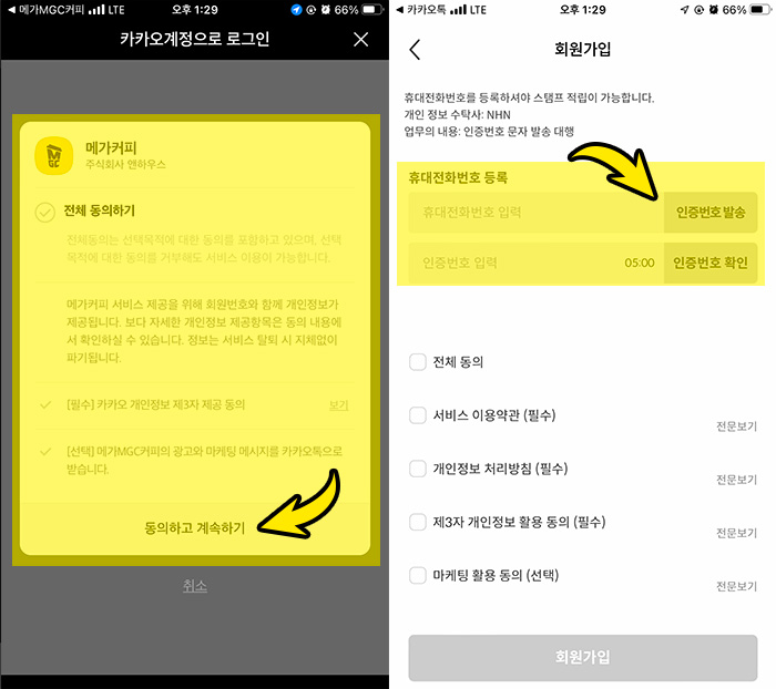 회원가입에서 스템프(메가커피 스템프10개를 적립하면 무료음료 쿠폰을 받습니다.)를 적립하려면 휴대폰 인증일 해야합니다. 자신의 전화번호를 입력하고 인증번호를 입력한 뒤에 역시나 필수 부분만 체크하고 회원가입을 진행해주세요.