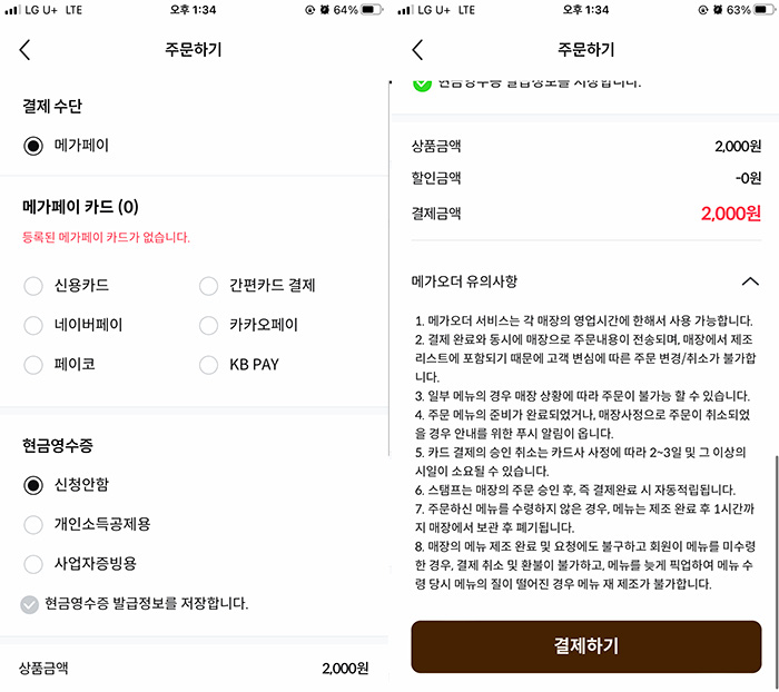 3. 이제 결제 부분인데요 메가페이라는 메가커피의 간편결제 시스템을 이용할건지 아니면 카드나 다른 페이 종류를 쓸건지 선택합니다. 현금영수증을 자동으로 발급하도록 발급정보를 저장하는 옵션도 있으니 잊지마시구요. 그리고 앱의 끝 부분에서 상품금액과 결제 금액을 확인한 다음에 "결제하기"를 선택하면 메가커피 앱에서 메가오더로 주문이 완료됩니다.