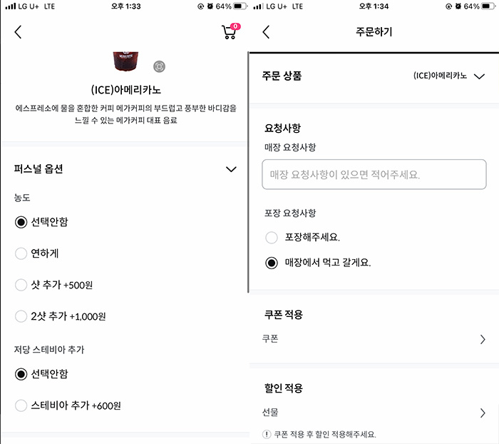 2. 스타벅스의 사이렌오더와 거의 비슷합니다. 주문한 음료의 옵션들을 선택하는데요. 농도를 연하게 또는 추가 금액을 지불하고 진하게 등의 설정이 가능하고 매장에서 마실건지 아니면 포장을 할건지 등을 선택한 다음에 쿠폰이나 할인을 적용합니다.