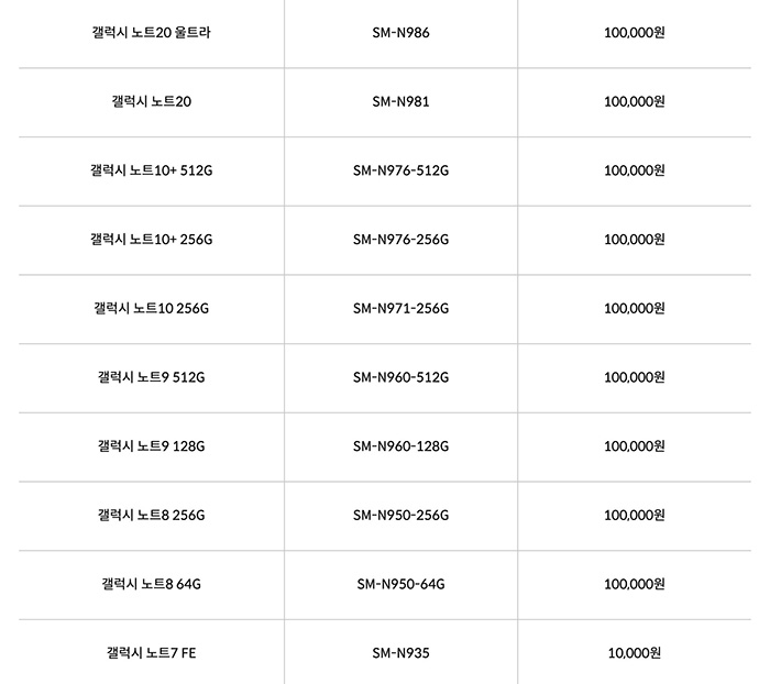 위의 매입 추가금 보상표를 보면 노트8 제품은 추가보상금 10만원을 맥스로 받습니다. 당근이나 번장에서 노트8 D급 (화면은 나오지만 액정은 깨지고 상태가 메롱인 부품용 스마트폰)을 5만원정도로 구입해서 매입하면 D급 시세 1만원 + 추가보상금 10만원 = 총 11만원을 입금받는 방식이죠. 중고로 구매한 가격 5만원을 빼면 6만원정도 차액이 생깁니다.