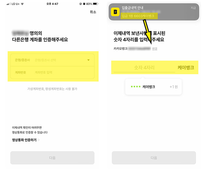 3. 신분증 확인이 끝나면... 본인 명의의 다른은행 계좌를 인증해야합니다. 진짜 비번 하나 설정하는데 인증이 어마어마합니다. 계좌인증은 케이뱅크에서 1원을 입금하면서 보낸사람의 이름이 "XXXX케이뱅크" 이런식으로 입금됩니다. 그 케이뱅크 앞 부분의 숫자를 입력하는 방식이죠. 이체를 확인할 은행과 계좌번호를 입력하고 다음 / 그러면 입력한 계좌로 1원 이체 / 그 숫자 입력하고 다음을 진행하면됩니다.